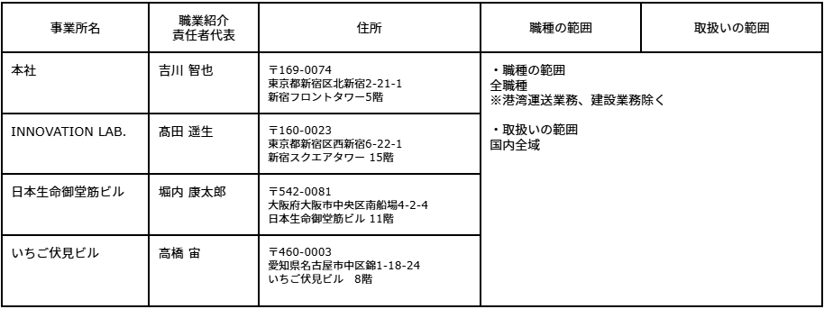 職業安定法第32条の13、職業安定法施行規則第24条の5に則り、下記の項目を明示します。