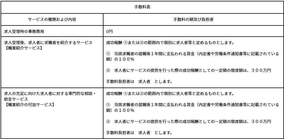 手数料は以下の通り、求人者より申し受けます。なお、届け出る手数料率は上限であり、実際の手数料については別途利用申込書・契約書等にて取り交わすものとなります。