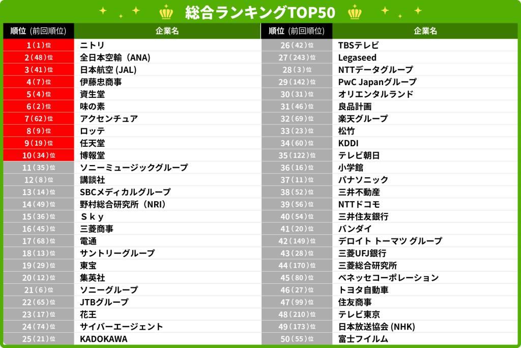 今回のランキングでは、コンサルティング業界が引き続き高い人気を集めました。ノミネートされた15社のうち13社が前年より順位を上げる結果となっています。