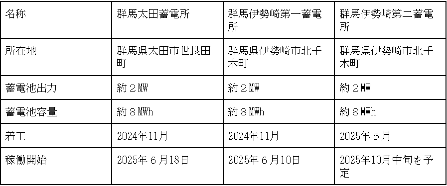 系統用蓄電所事業への検証に向けては、前期2025年3月期において3ヶ所の蓄電所開発を進めておりました。今期2026年3月期においては、ポート群馬伊勢崎第一蓄電所(稼働開始日:2025年6月10日)、ポート群馬太田蓄電所(稼働開始日:2025年6月18日)、ポート群馬伊勢崎第二蓄電所(稼働開始予定日:2025年10月中旬)の稼働を開始しております。第一弾のポート群馬伊勢崎第一蓄電所において6月10日の稼働開始後3~6ヶ月後には需給調整市場での取引開始を計画しておりましたが、この度、計画通り順調にポート群馬伊勢崎第一蓄電所が需給調整市場(一次調整力)での取引を開始いたしました。今後は、需給調整市場(二次調整力、三次調整力)での取引にも参入する予定です。また第二弾のポート群馬太田蓄電所、第三弾のポート群馬伊勢崎第二蓄電所も需給調整市場での取引開始に向けて準備をしております。