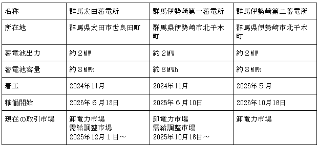 第一弾のポート群馬伊勢崎第一蓄電所においては、2025年10月16日付公表の「系統用蓄電所の需給調整市場での取引開始のお知らせ」に記載の通り、当初計画通り需給調整市場(一次調整力)での取引を開始しております。そしてこの度、第二弾のポート群馬太田蓄電所においても、需給調整市場(一次調整力)での取引を開始いたしました。
