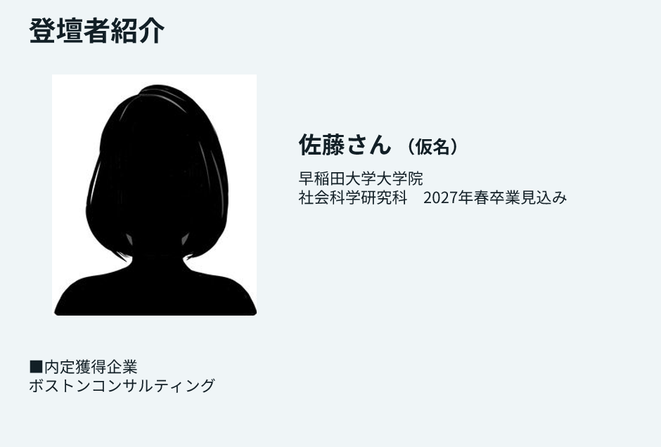 本セミナーでは、佐藤さん(仮名)をお迎えし、昨今の学生のリアルな考えやインターンの良しあしなどについて伺います。優秀学生の考え方や動向を知りたい方はぜひご参加ください。