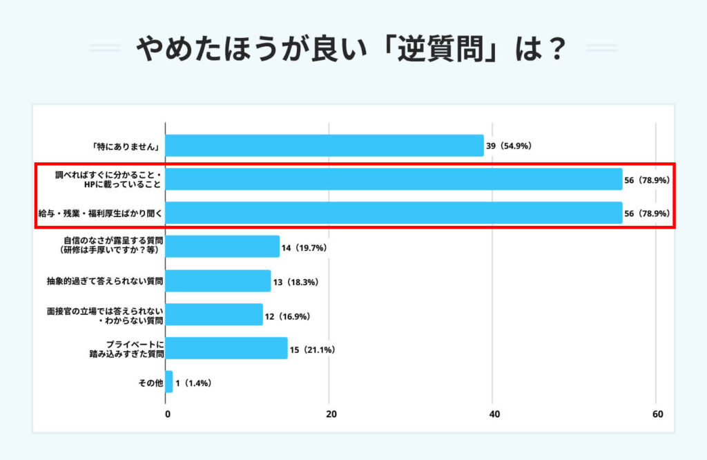 面接では、既知の情報や条件面の逆質問は控えましょう。コンサルタント67名への調査でも、8割以上が避けるべきと回答しています。
