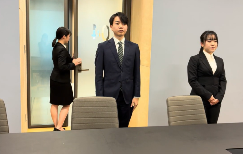 入室の際は、先頭の学生がノックと開閉、最後尾の学生が閉扉を担当することが一般的です。一連の流れを事前に覚えておくとスムーズに対応できます。