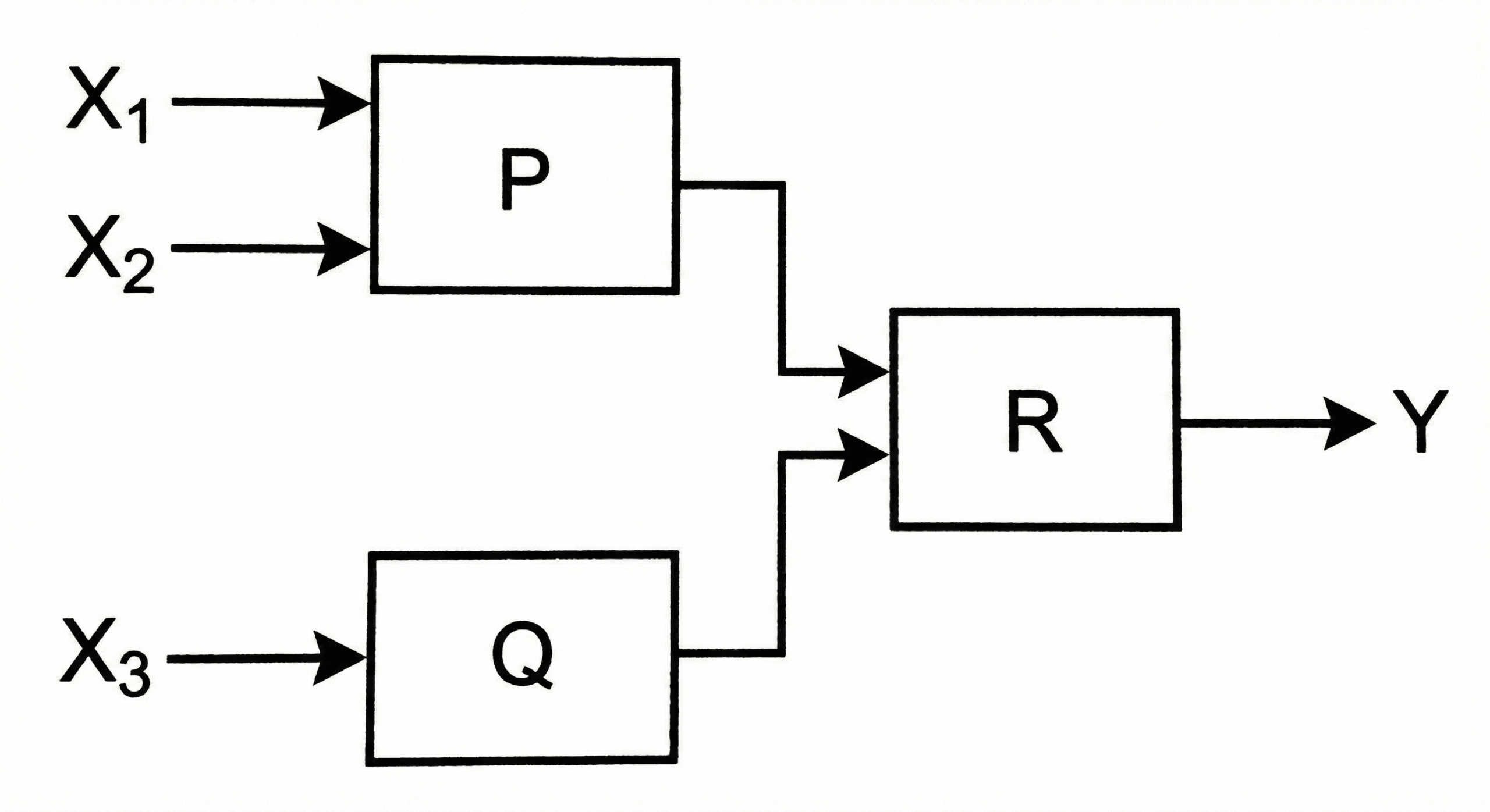 これらの装置をつなぎ、図のような回路を作った。このとき、Yが0になる入力信号X1、X2、X3の組み合わせとして正しいものはどれか。