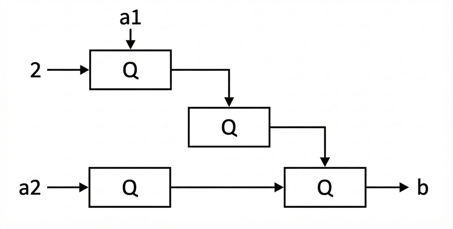 装置Qをつないで図のような回路を作った。a1に3、a2に4を入力したとき、bはいくつになるか。
