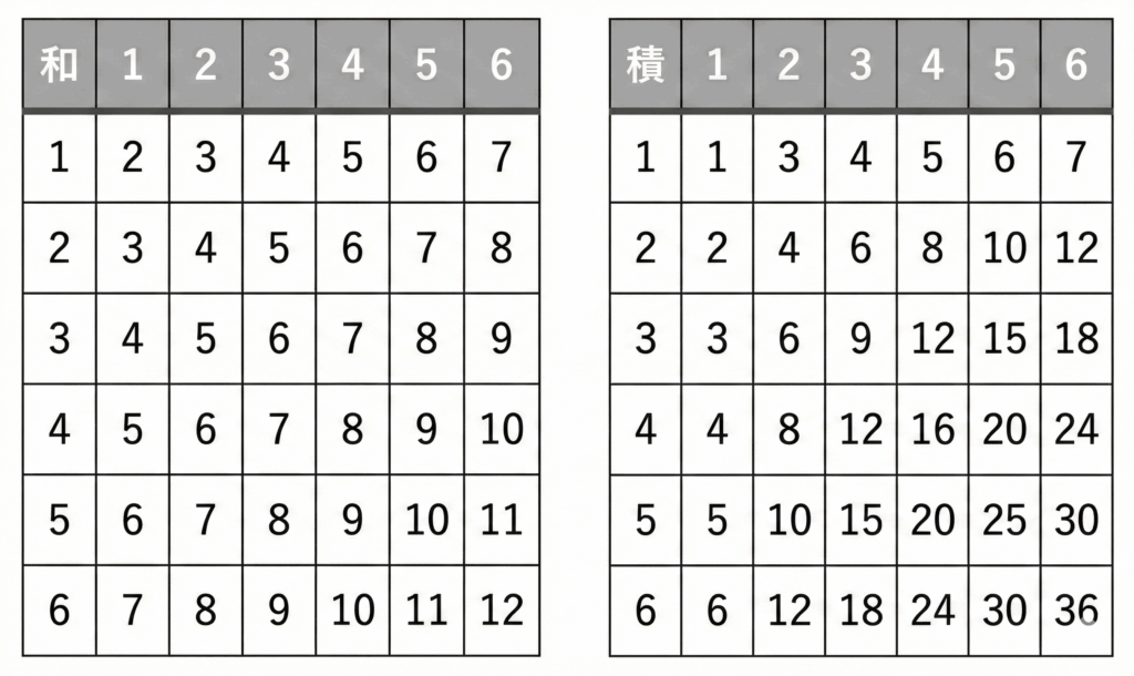 この問題を解く際、頭の中だけで計算しようとするとケアレスミスが起きやすいため、まずは「6×6のマトリックス(表)」をイメージすることが確実な一歩となります。