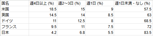 まず、日本の週1日以上の合計を求める。4.2+6.8+5.5=16.5%となる。次に、米国の「週4日以上」の割合である18.5%を、日本の合計で割る。18.5÷16.5=1.121……となる。小数点以下第2位を四捨五入すると1.1となるため、正解はBである。