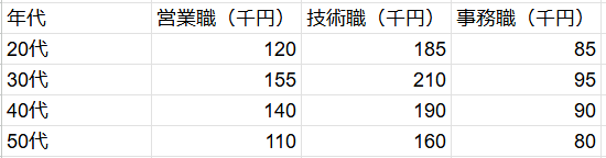 20代の従業員が「営業5人、技術3人、事務2人(計10人)」いると仮定して、全員の研修費の合計を出し、10で割る。