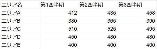 第1四半期から第3四半期までの推移を比較する。エリアAは412から435、458と一貫して増えている。エリアBは第2四半期に減少しており、エリアCは第3四半期に減少している。エリアDは第2から第3にかけて横ばいであり、エリアEはすべて同数である。「伸びている」は数値が超過していることを指すため、これらはいずれも除外される。よって、エリアAが正解である。