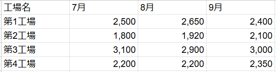 各工場の数値を時系列で確認する。第1工場は8月から9月にかけて減少している。第2工場は1,800から1,920、さらに2,100へと継続して増加しているため、条件に合致する。第3工場は7月から8月にかけて減少しており、第4工場は7月から8月が同数であって「伸びている」とはいえない。したがって、正解は第2工場となる。