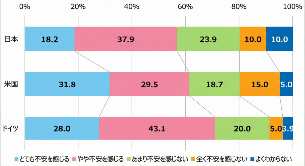 まず、日本における不安を感じる人の合計を求める。18.2+37.9=56.1(%)となる。次に、米国における同様の合計を求める。31.8+29.5=61.3(%)となる。これらの差を求めると「61.3-56.1=5.2」となり、差は5.2%であることがわかる。よって、選択肢Cが正解として導き出される。単純な一項目の比較ではなく、2つの項目の和を求めたうえで比較をおこなう必要がある。