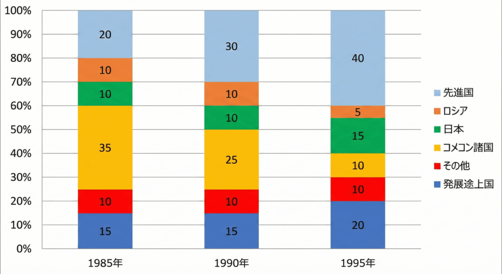 1985年のコメコン諸国への貿易額をTとしたとき、1985年における全体の貿易額を表す式として正しいものを以下の選択肢の中から一つ選びなさい。