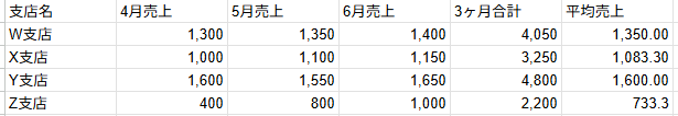 各支店の3カ月間の平均売上を算出する。W支店は(1,300+1,350+1,400)/3で1,350となり、1,300の1.2倍(1,560)を下回る。X支店は平均1,083.3……で、1,000の1.2倍(1,200)を下回る。Y支店は平均1,600で、1,600の1.2倍(1,920)を下回る。Z支店は平均733.3……で、400の1.2倍(480)を大きく上回る。条件を満たすのはZ支店のみであるため、正解はBとなる。