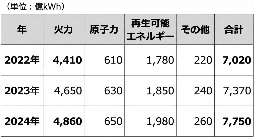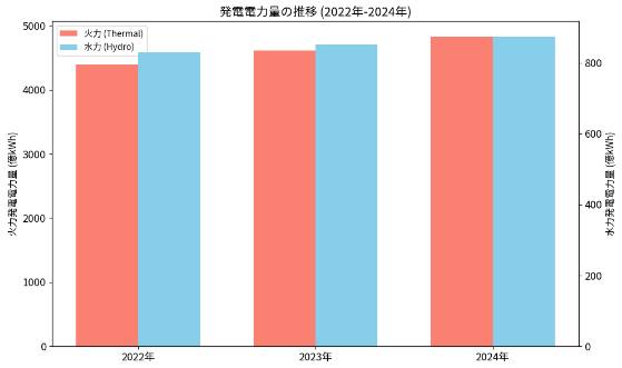 まず、2022年から2024年までの水力の合計増加量を求める。890-842=48億kWhであり、2年間での増加であるため、1年あたりの平均増加量は48÷2=24億kWhとなる。2025年の数値は、2024年の890億kWhに平均増加量の24億kWhを加算して、914億kWhと算出できる。増加の起算点や期間の設定を誤ると、異なる数値が導かれるため注意を要する。
