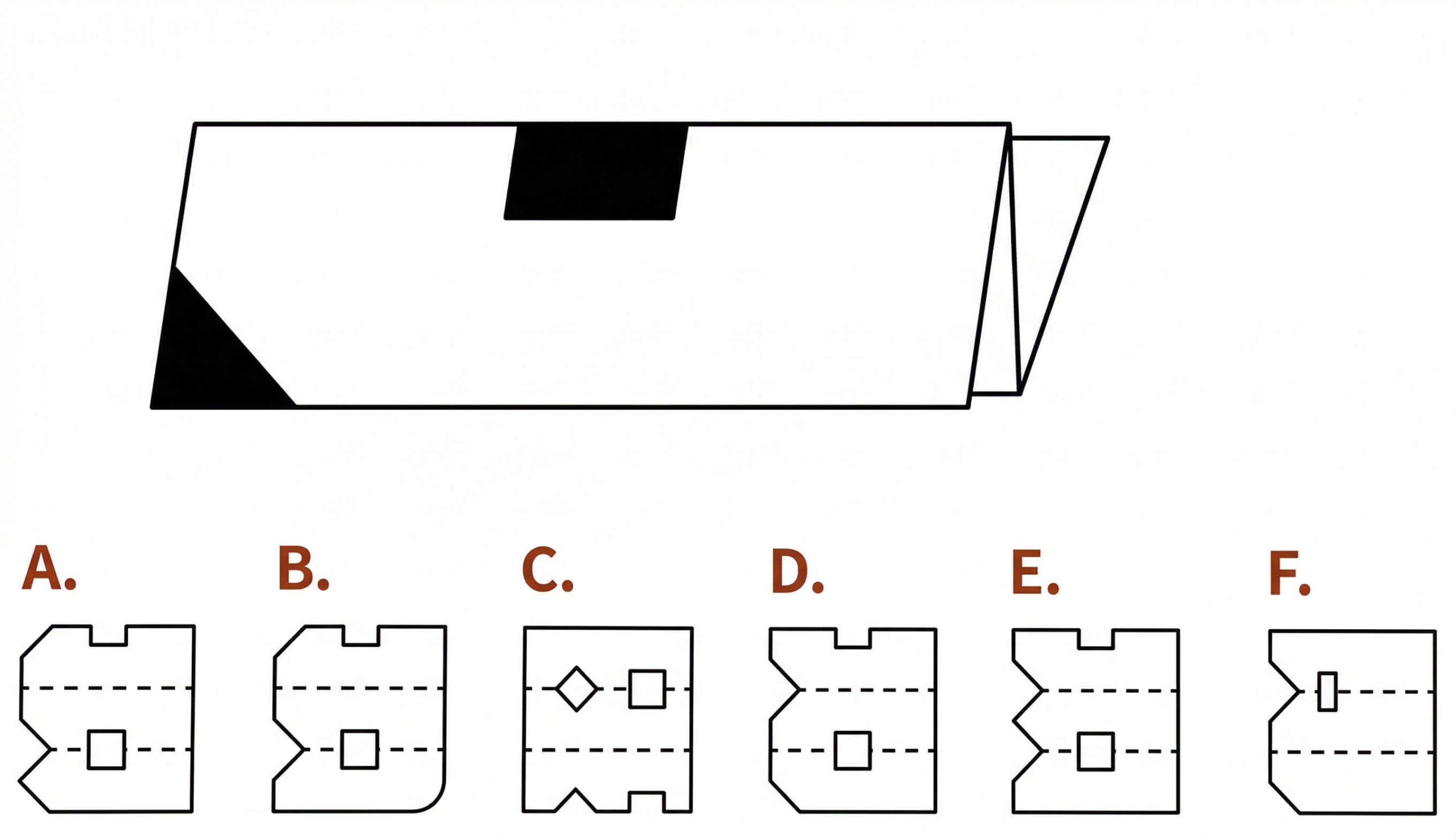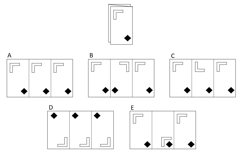 3つに折りたたんだうち、設問で見える手前の面を➀、中の面を➁、奥の面を➂とする。切り抜いて広げたときに、➂は➀とぴったり同じ形に切り抜かれる。➁は、➀との折り目を対称の軸として、線対称な形に切り抜かれる。切り抜いたあとの折り紙は、選択肢Dのようになる。