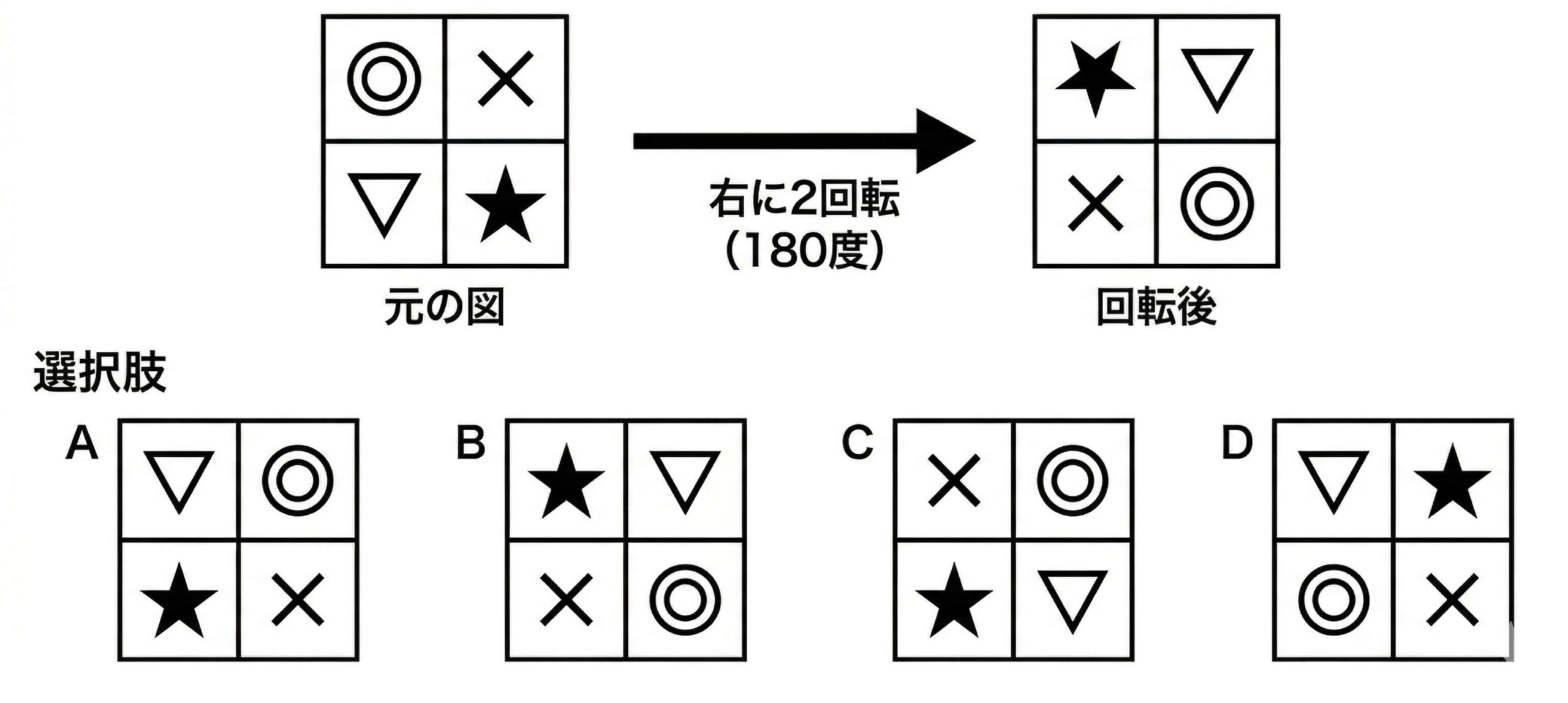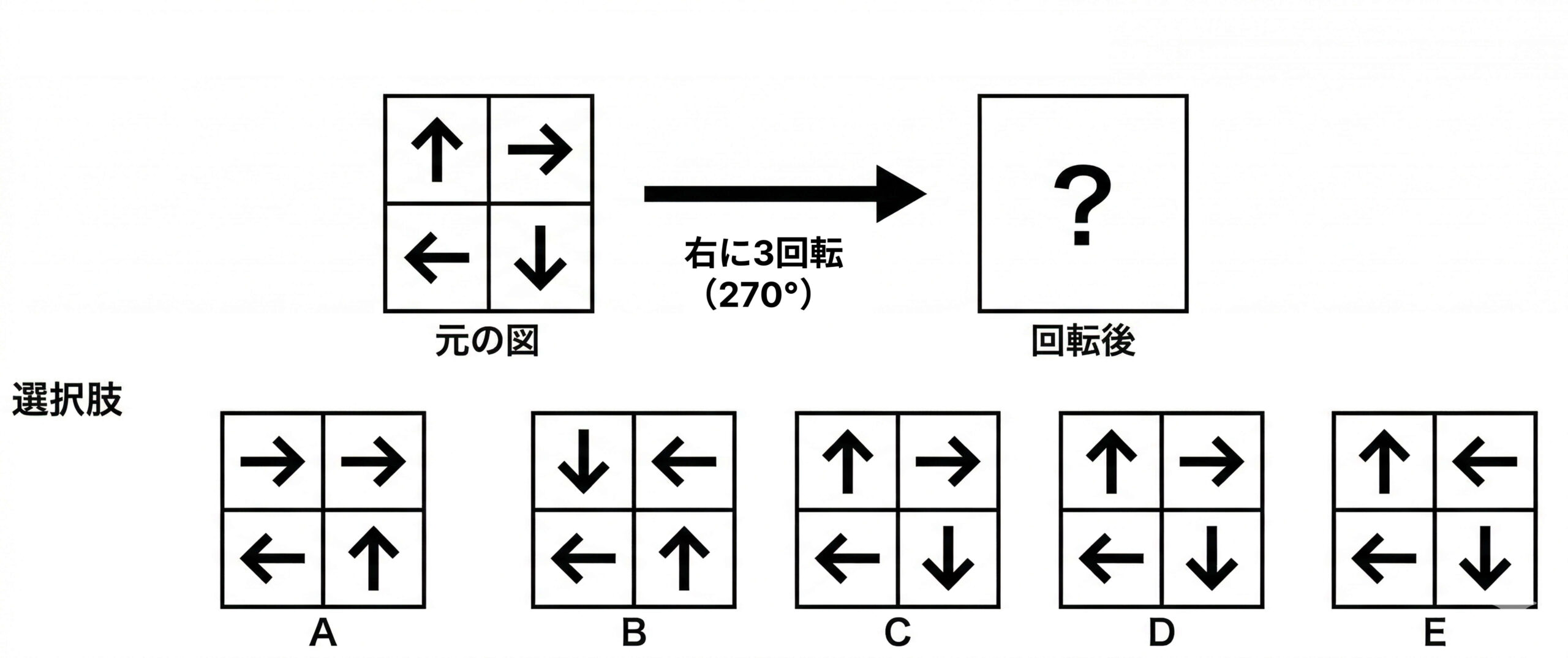 右に3回転がす動作は、左に1回転がす動作と同じ結果をもたらす。左に1回転がすと、もともと右側にあった図形(→、↓)が上側に移動して↑、→になる。左側にあった図形(↑、←)が下側に移動して、←、↓となる。よって正解はDとなる。この図の矢印の向きには一貫性があり、何度転がしても同じ図であるということに気付ければ、元の図と同じDを一瞬で選ぶこともできる。