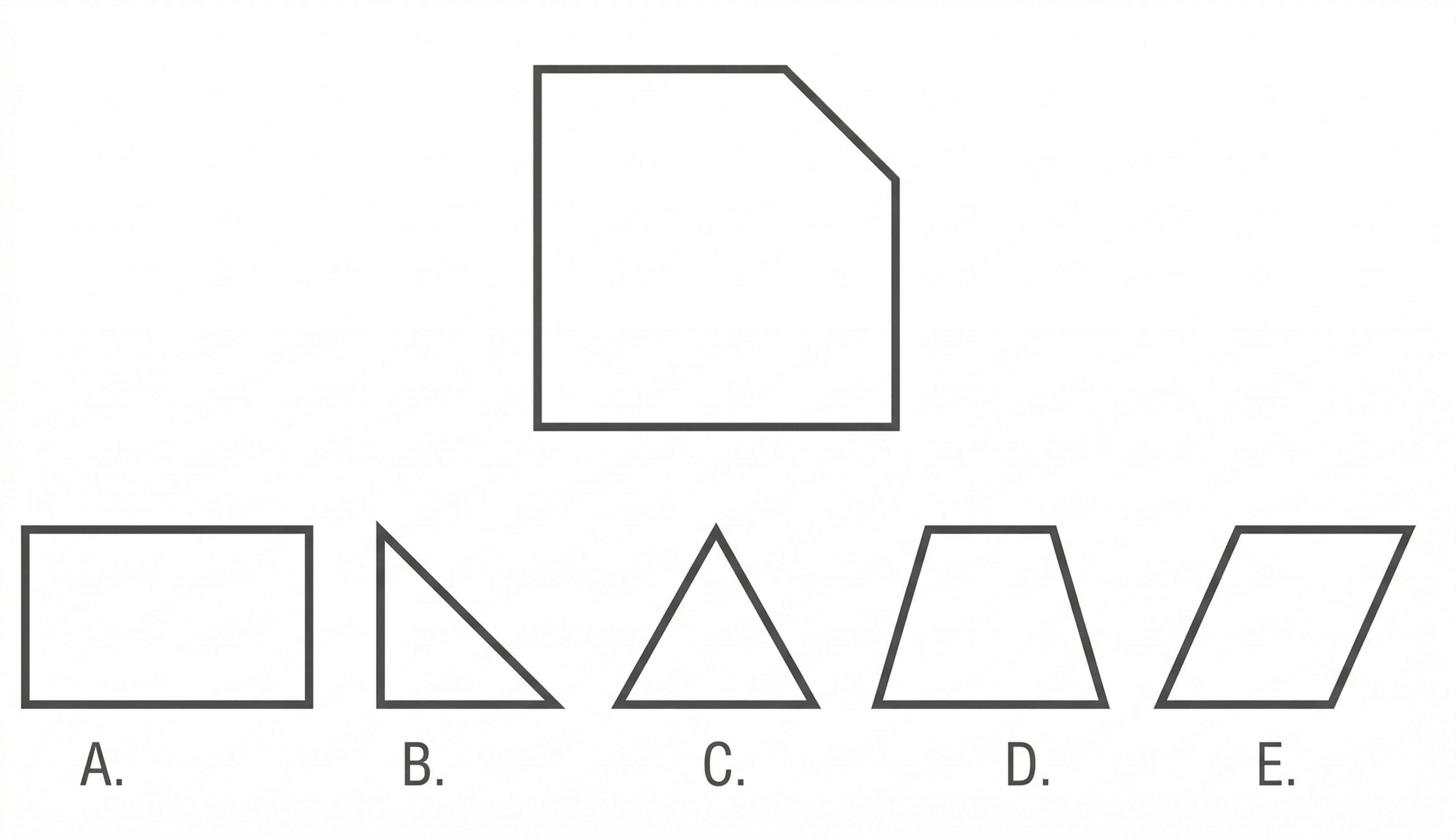 正方形の4つの角はすべて90度である。問題図は右上の角が欠けているため、ここを補って90度にするには、直角を持つ図形が必要になる。選択肢の中で直角を持つ三角形はBのみである。したがって、Bが当てはまる。