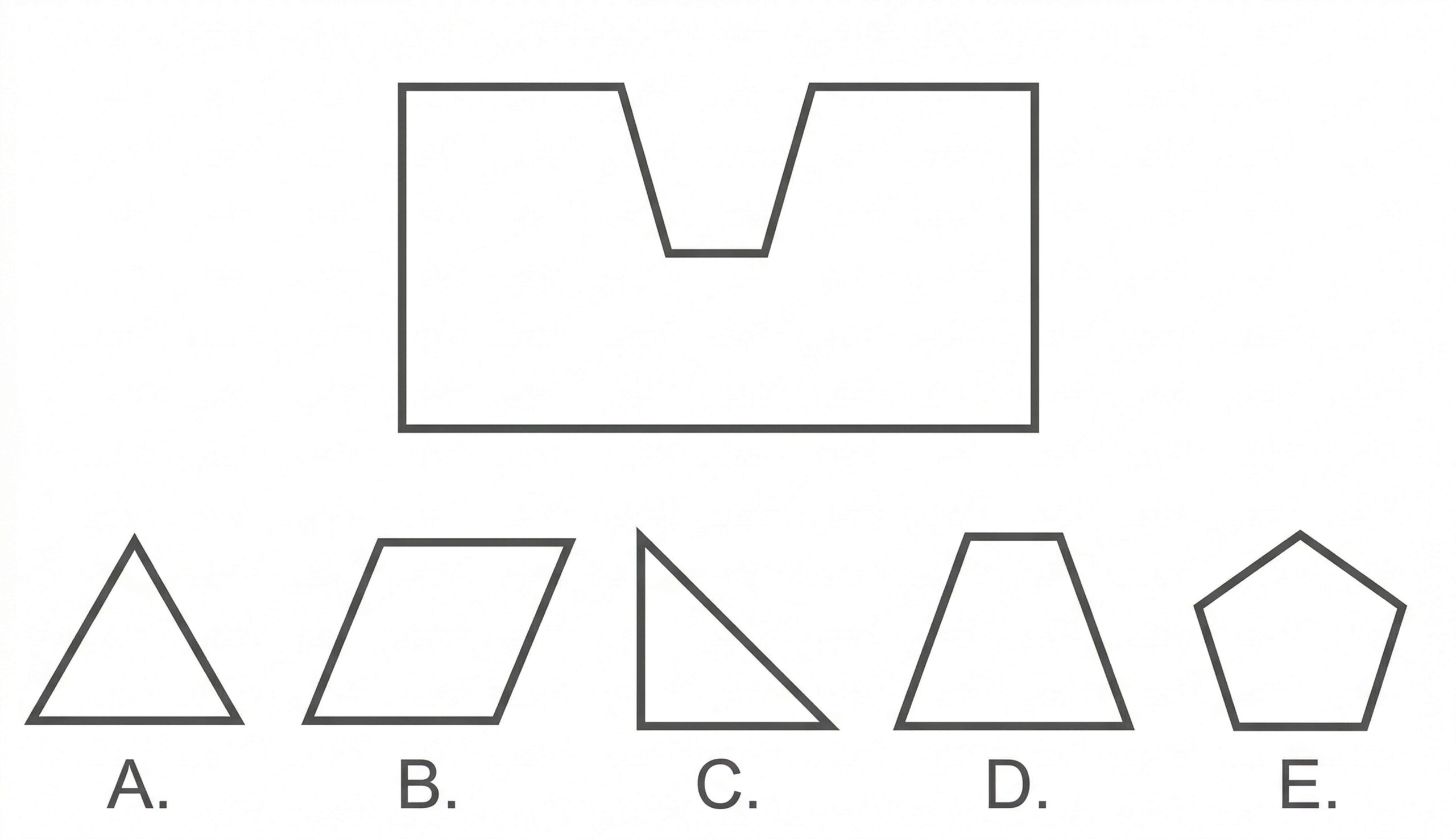 図形に、選択肢1~5の図形を一つ補って長方形にしたい。当てはまる図形はどれか。ただし、裏返すことはしないものとする。