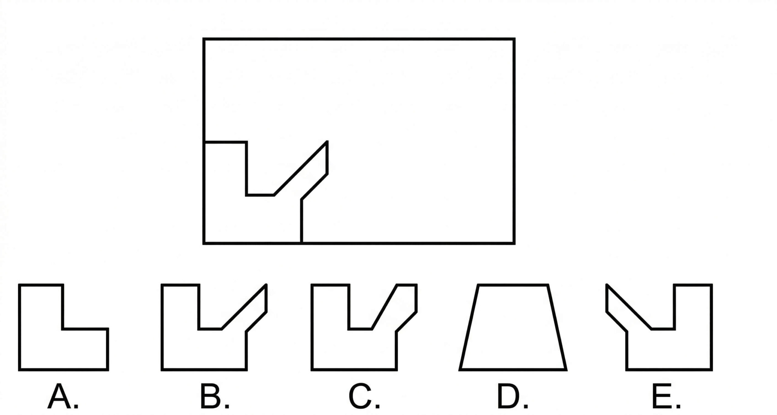 長方形の左下部分が、垂直、水平、斜めの線で複雑に切り取られている。この空洞を埋めるには、切り口と完全に一致する凸部を持つ図形が必要である。選択肢BとCは形状が似ているが、問題図の斜めの切り口と角度が合うのはBである。なお、Eは左右反転させないと当てはまらないため不適である。したがって、Bがあてはまる。
