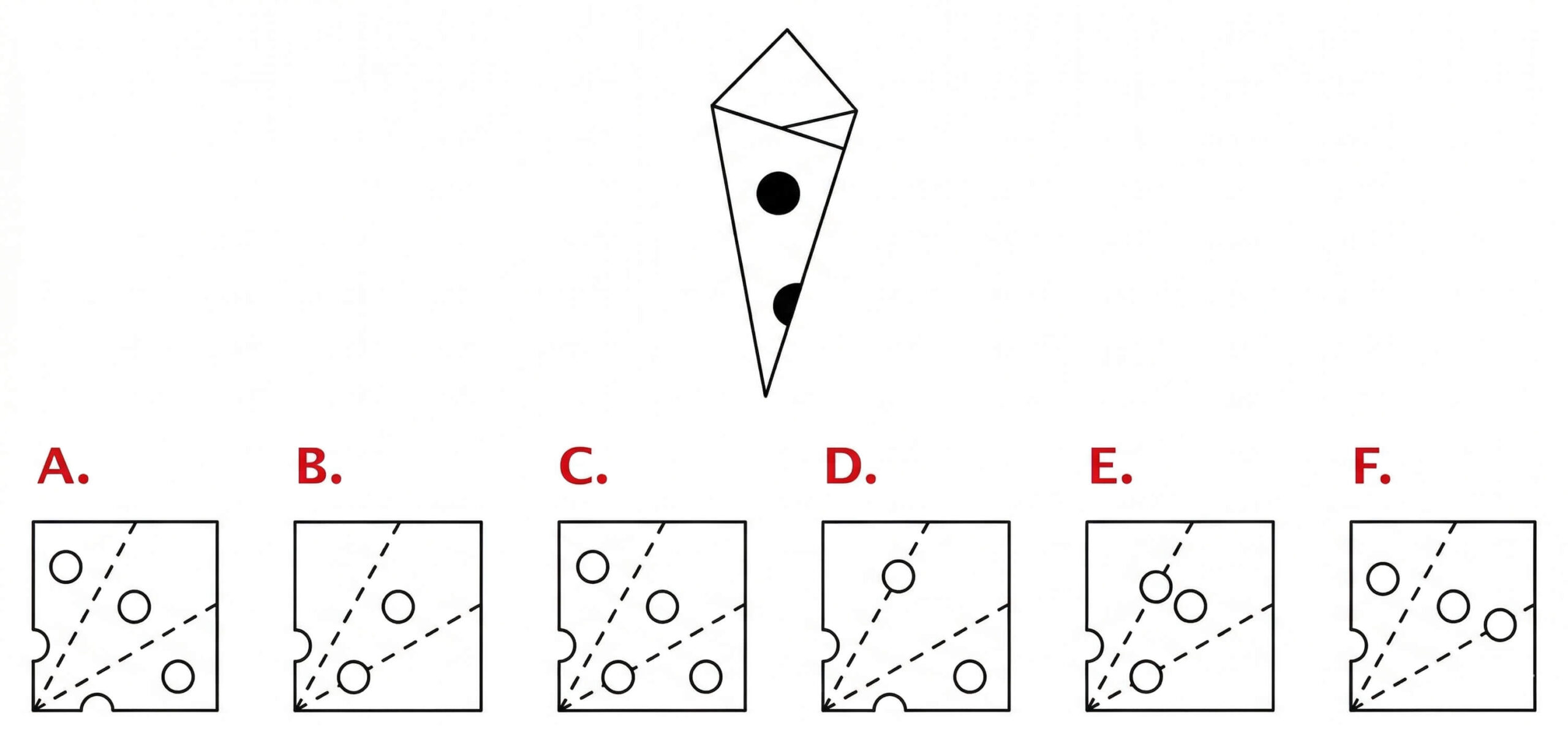 3つに折りたたんだうち、設問で見える手前の面を➀、奥の面を➁、中の面を➂とする。2つのうち上段の黒色の部分は、➀~➂まで円のままで切り抜かれる。当てはまる選択肢はAとC。2つのうち下段の黒色の部分は、➀は半円のまま切り抜かれるが、➁と➂は折り目をはさむため、円で切り抜かれる。AとCのうち、当てはまるのはC。