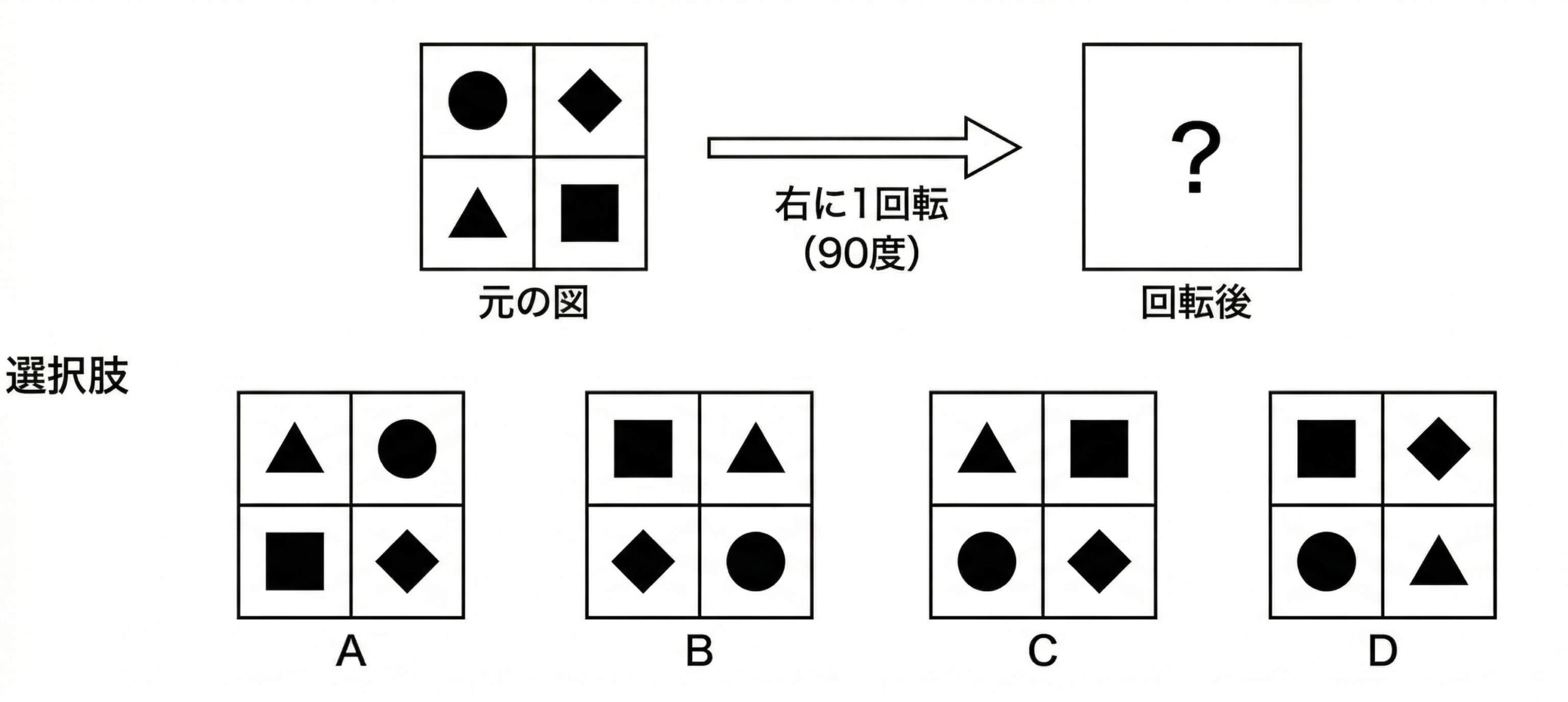 図を右に1回転がすと、もともと左側にあった図形が上側に、右側にあった図形が下側に移動する。したがって、左上の●は右上に、左下の▲は左上に、右上の◆は右下に、右下の■は左下に配置される。この動きを正確にとらえると、左上に▲、右上に●、左下に■、右下に◆が位置するAが正解となる。