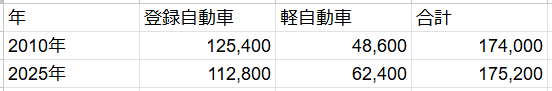 2025年の軽自動車数を1とすると、2010年の軽自動車数はおよそいくつで表されるか。最も近いものを以下の選択肢の中から一つ選びなさい。