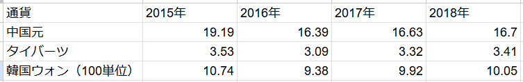 Aは(3.32÷3.09-1)×100≒7.44%となり、約7.4%上昇しているため正しい。Bは(16.39÷19.19-1)×100≒-14.59%となり、約14.6%の下落であるため誤り。Cは16.70÷3.41≒4.90倍であり、5.5倍ではない。Dは安定性の定義が表にはないため判断不可。Eは2015年のレートが3.53円であるため、3円以下では交換できず誤りである。
