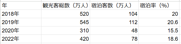 与えられた表には2018年、2019年、2020年、2022年の数値は記載されているが、2021年の項目自体が存在しない。また、観光客数の推移に一定の計算式や規則性も見いだせないため、表にあるデータのみから2021年の正確な数値を導き出すことは不可能である。したがって、正解は「表からはわからない」となる。