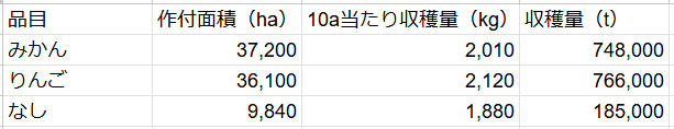 表には「みかん」「りんご」「なし」の3つの品目に関するデータのみが掲載されており、「ぶどう」に関する具体的な数値や、ほかの果実との相関関係を示す情報は一切含まれていない。ほかの品目の数値からぶどうの数値を推測する論理的根拠もないため、提示された資料のみでは回答を特定できない。そのため、正解は「表からはわからない」となる。