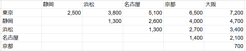 表の見方は、縦軸と横軸が交差する地点が2つの停留所間の運賃を示している。静岡から出発する場合、縦軸の「静岡」の行と、横軸の「京都」の列が交わる箇所を確認すれば良い。表の数値を参照すると、静岡と京都の交点は4,000となっている。したがって、静岡と京都の間の運賃は4,000円であることがわかる。