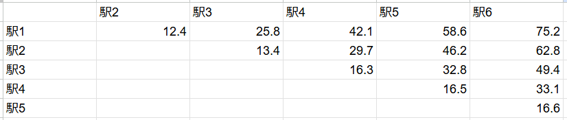 表において、2つの駅が交差する地点がその駅間の距離を表している。駅2と駅5の距離を求めるには、縦軸の「駅2」と横軸の「駅5」が交わる数値を確認する。表をたどると、その数値は46.2となっている。したがって、駅2から駅5までの距離は46.2kmである。なお、駅1からの累計距離や、隣接する駅との区間距離と間違えないように注意が必要である。