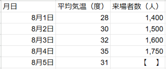 ある遊園地では、日ごとの平均気温と来場者数を集計している。上記の表の空欄に入る、8月5日の来場者数は何人と推測できるか。