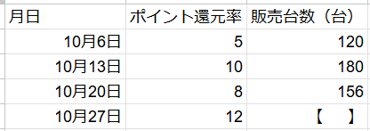 ある家電量販店では、週末のポイント還元率と特定の掃除機の販売台数を記録している。上記の表にもとづき、10月27日の販売台数は何台と推測できるか。