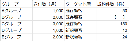 ある企業で、ダイレクトメールの送付数と成約件数の関係を調査している。上記の表にもとづき、Bグループにおける成約件数は何件と推測できるか。
