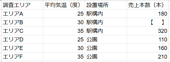設置場所が同じエリアごとに比較すると、気温が上がるにつれて売上本数が増加する法則性が見て取れる。公園に設置されたD・E・Fエリアでは、気温が5度上がるごとに売上が50本ずつ(110→160→210)一定の幅で増加している。駅構内に設置されたA・B・Cエリアでも同様に一定幅で増加すると推測される。A(25度)が180本、C(35度)が320本であるため、その中間であるB(30度)の数値は、180と320のちょうど真ん中にあたる250本(増加幅70本)と導き出せる。