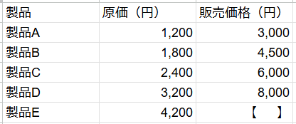 あるアパレルメーカーで、製品の種類ごとの原価と販売価格をまとめている。上記の表にもとづき、製品Eの販売価格はいくらと推測できるか。