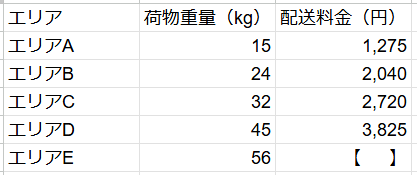 ある物流会社で、配送エリア別の荷物重量と配送料金の関係を調査している。上記の表にもとづき、エリアEの配送料金はいくらと推測できるか。
