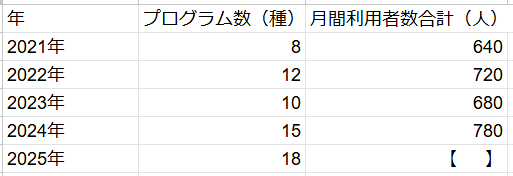 あるスポーツジムで、提供しているプログラム数と月間利用者数の推移を記録している。上記の表にもとづき、2025年の月間利用者数の合計は何人と推測できるか。