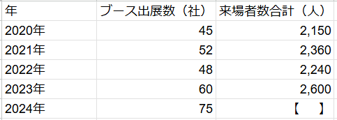 ブース出展数の一社あたりの来場者数増分を算出する。2020年から2021年にかけて、ブース数が7社増えた際に来場者数は210人増加している。ここから、ブースが一社増えるごとに来場者数が30人増える法則がある。2023年から2024年にかけては、ブース数が60から75へと15社増加している。増加する来場者数は15×30=450人となるため、2,600+450=3,050人となる。したがって、正解は3,050人である。