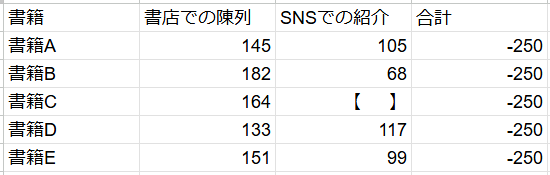 ある食品メーカーで、新商品の試食アンケートの結果をまとめている。上記の表にもとづき、商品Eにおいて「満足」と回答した人数は何人と推測できるか。