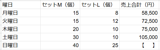 各メニューの単価を求める。月曜日と火曜日を比較すると、セットMは同数でセットLが4個増えており、売上は14,000円増加している。ここからセットLの単価は3,500円とわかる。次に木曜日と土曜日を比較すると、セットLは同数でセットMが10個増えており、売上は30,000円増加している。よってセットMの単価は3,000円である。日曜日の売上は、3,000×40+3,500×25=120,000+87,500=207,500円となる。