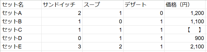 あるインテリアショップで、新生活応援セットの販売価格をまとめている。上記の表にもとづき、セットDの価格はいくらと推測できるか。