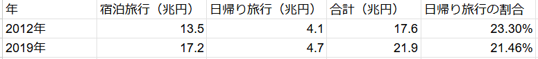 まず、2012年と2019年の日帰り旅行の割合をそれぞれ「日帰り旅行 ÷ 合計」で求める。