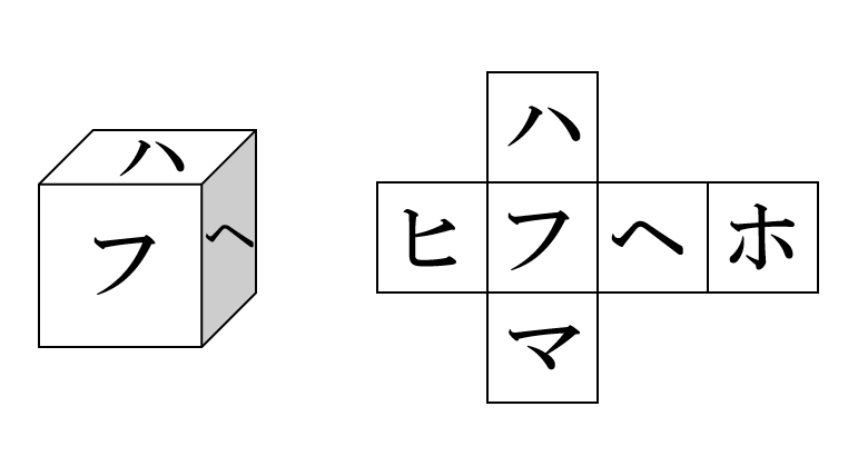Aは、右に転がしてハが右側面に移動し、左に転がして上面に戻るため、ハが上面になる。