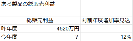 ある製品の昨年度の総販売利益が4,520万円であり、今年度の総販売利益の対前年度増加率がおよそ12%になると見込まれるとき、今年度の総販売利益はおよそ何万円か。最も近いものを、以下の選択肢から1つ選びなさい。