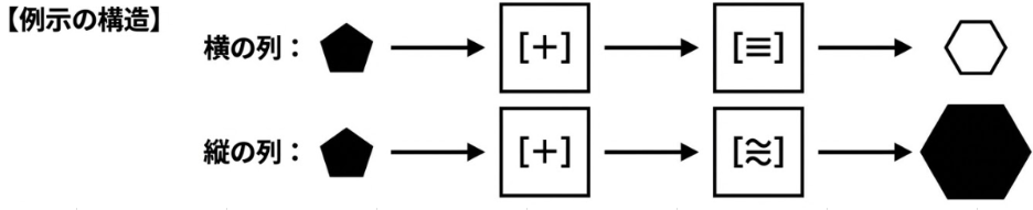 また、横の[≡]は「色を白くする」、縦の[≋]は「サイズを大きくする」変化を指す。問いでは「黒い小さな三角形」が[+]のみを通過するため、色とサイズはそのままで角が増えた状態である「黒い小さな四角形」が正解となる。