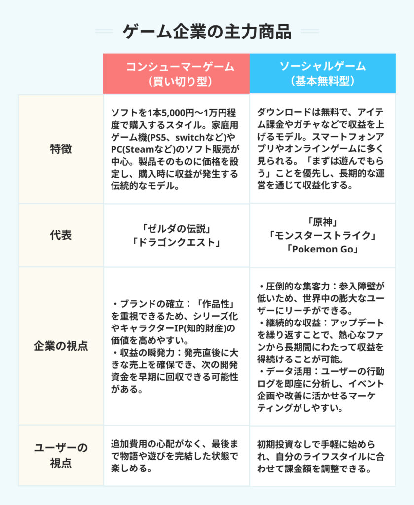 | 任天堂 | ●:「マリオ」「ゼルダ」など、ハードの魅力を最大化するソフトの内製開発・プロデュース ★:自社IPを世界に届ける販売元として、一貫したブランド戦略を展開 ▲:「Nintendo Switch」など、独自の遊びを可能にするハードウェアとオンラインストアを運営 |
