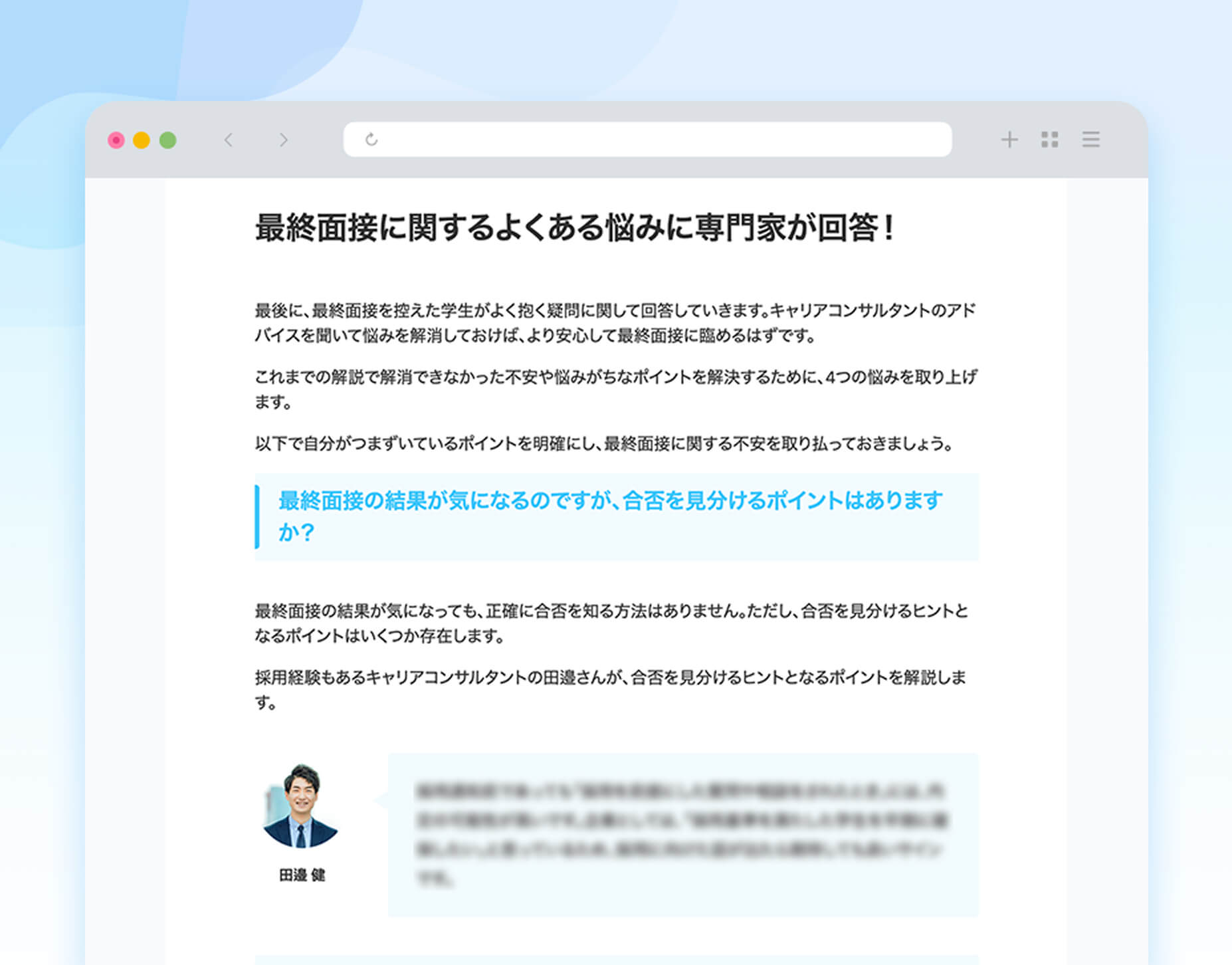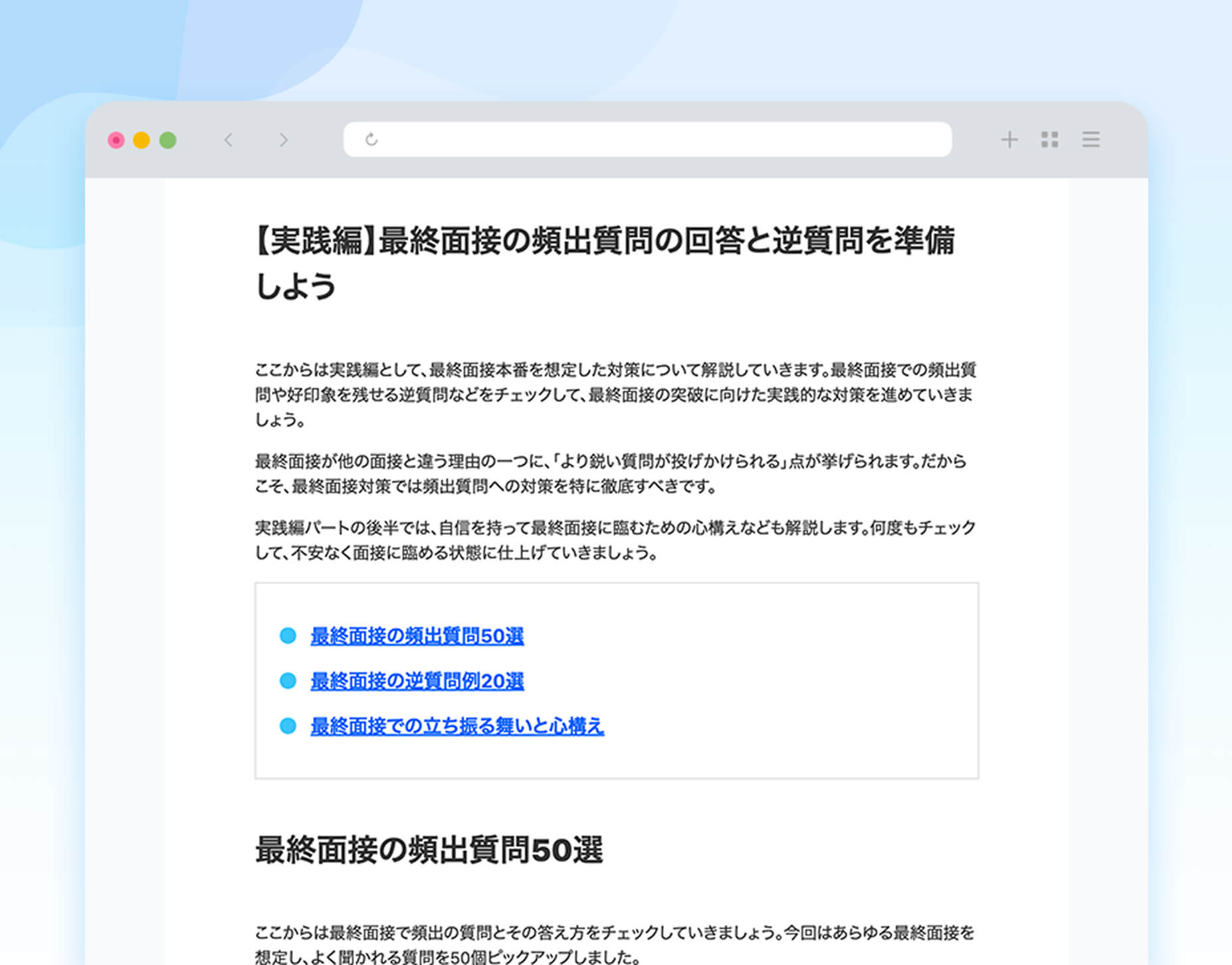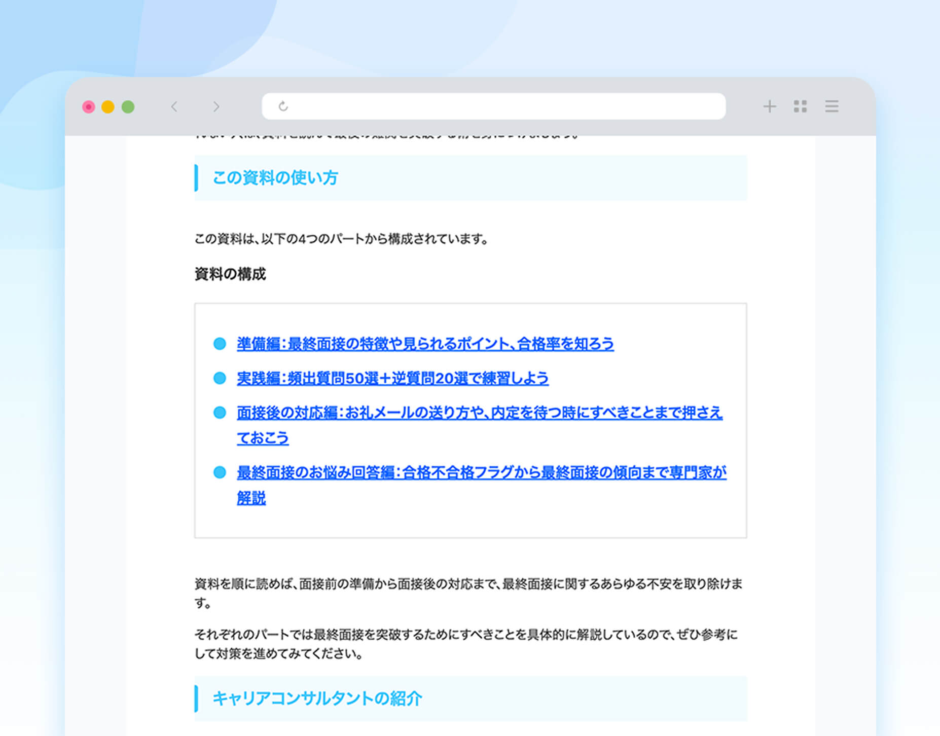 最後に「面接後の対応編」でお礼メールなどを確認し、「お悩み回答編」で細かな不安を解消。準備から面接後まで、万全の体制を整えます。