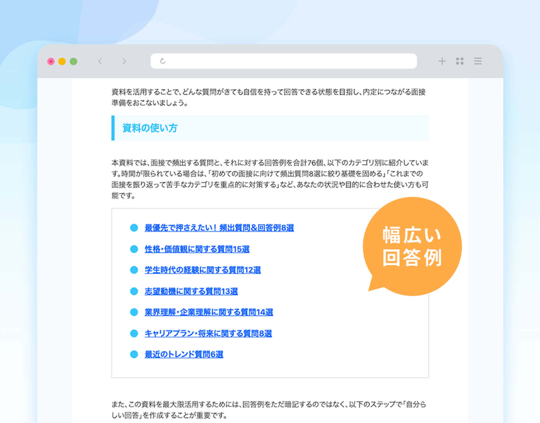 国家資格を持つキャリアコンサルタントや専門家が監修したカテゴリー別76種の面接質問&回答が特徴です。例文だけでなく質問の意図や回答のコツ、評価ポイントなどを専門家の視点で解説。この1冊でほかの就活生と差別化する方法までフォローします。